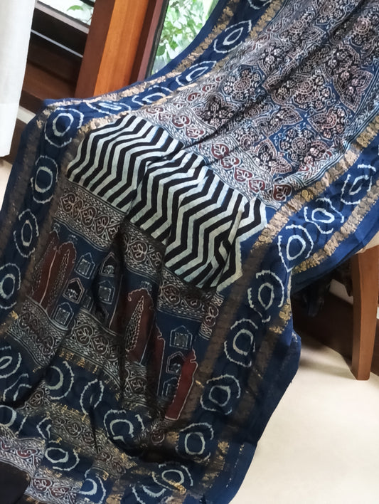 Indigo Blue and Black - Modal Silk Ajrakh handblock print saree