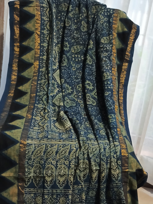Indigo Blue - Madurai Sungudi Cotton Designer Ajrakh Handblock printed saree