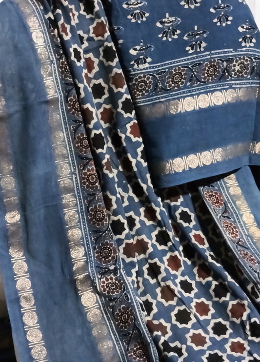 Light Indigo blue - Madurai Sungudi Cotton Designer Ajrakh Handblock printed saree