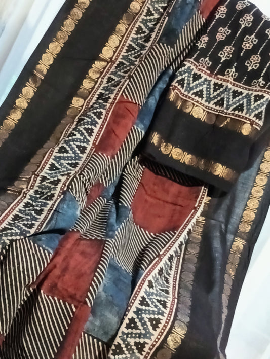 Black - Madurai Sungudi Cotton Designer Ajrakh Handblock printed saree