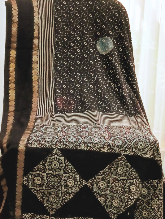Black - Madurai Sungudi Cotton Designer Ajrakh Handblock printed saree (ON SALE due to a small hole in the pallu)