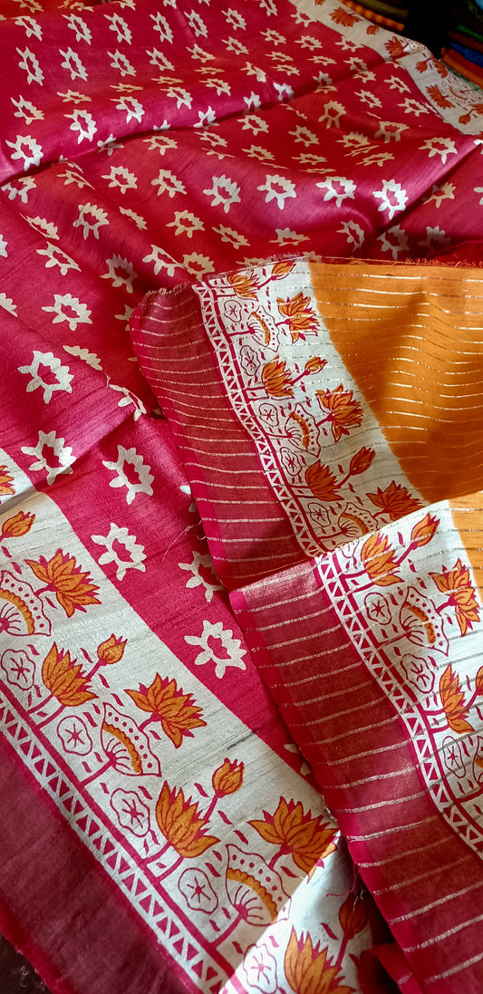 Red body with Beige border/Pallu Pure Tussar Saree in handblock prints