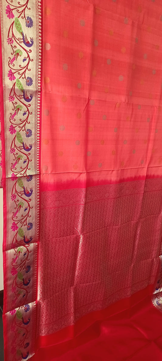 Coral Pink Shot colour and Red Paithani border Venkatagiri Pure Silk saree