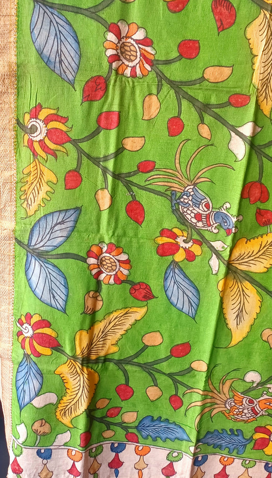 Parrot Green Srikalahasti Pen Kalamkari Cotton Handpainted Dupatta