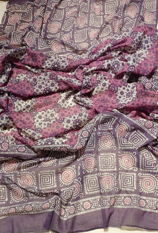 Purple designer hand wax batik on mul cotton dupatta