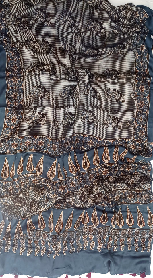 Indigo Blue and Black - Modal Silk Ajrakh handblock print saree