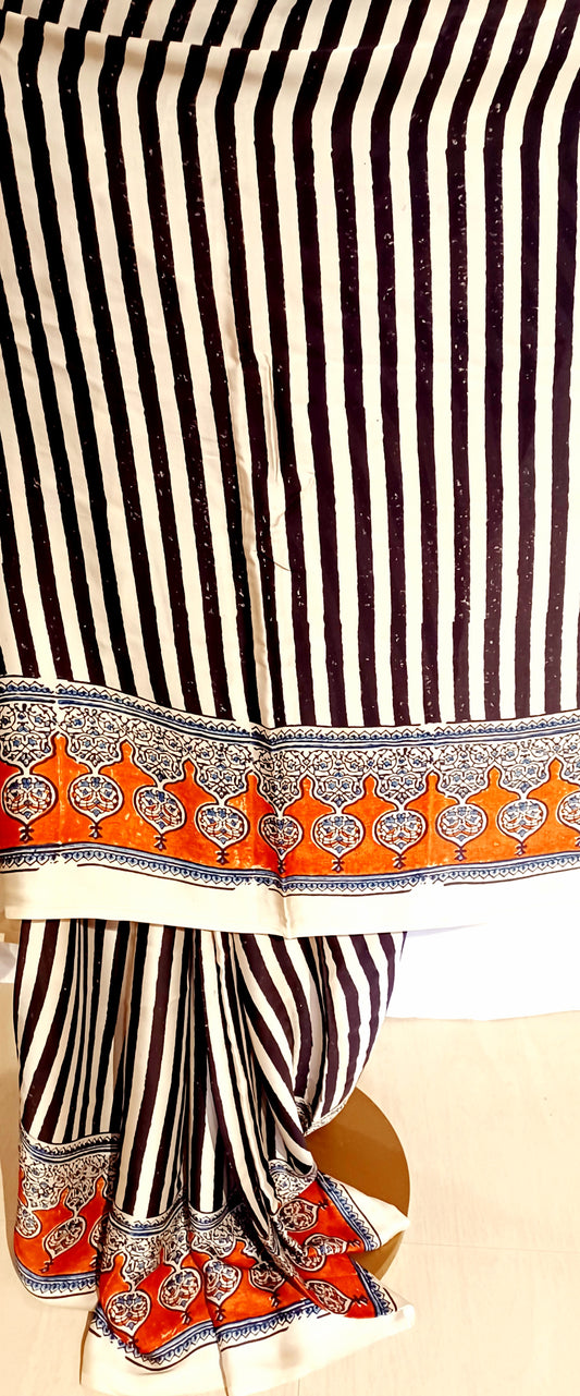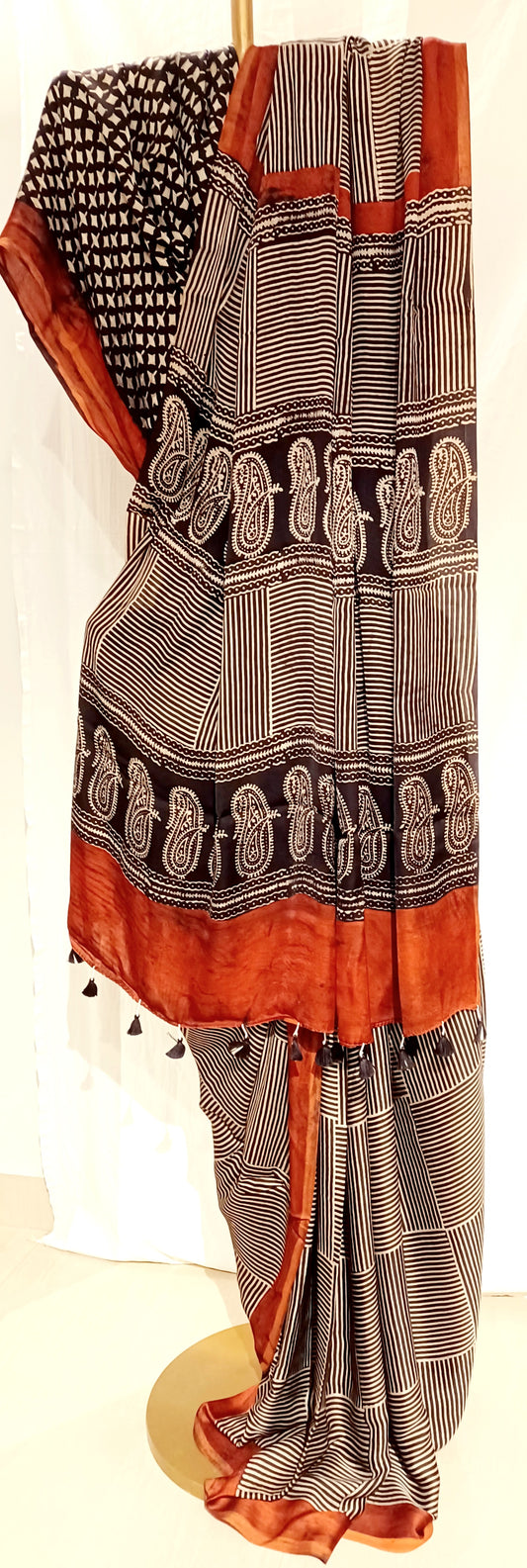 Black, White and Rust - Modal Silk Ajrakh handblock print saree