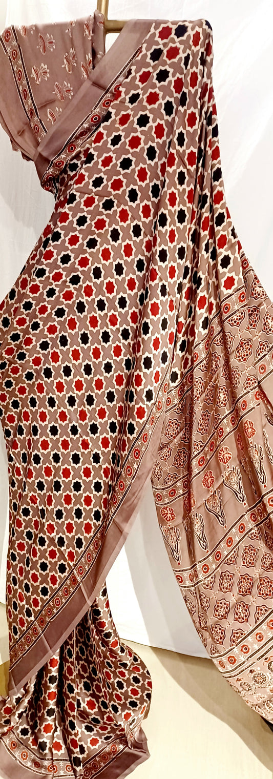 Brown (Taupe) - Modal Silk Ajrakh handblock print saree