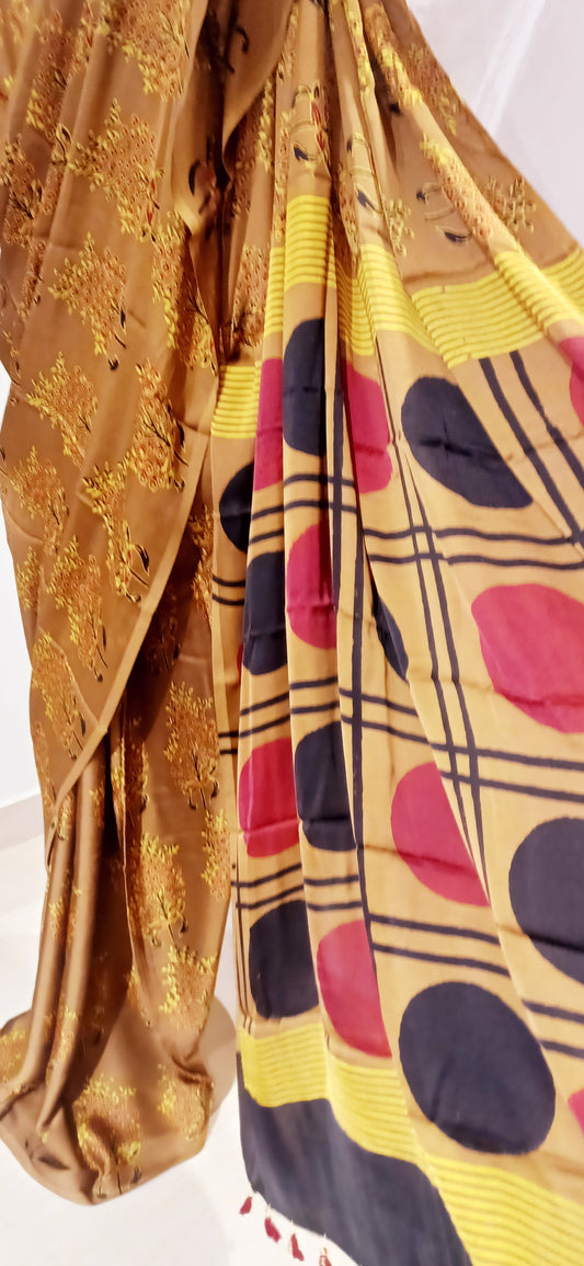 Modal silk is a biodegradable man-made fabric that is lightweight, breathable and smooth that has a luxury feel of silk and comfort of cotton. It is a wood pulp based cellulosic fibre extracted from beech trees. The cellulose extracted from the beech trees is spun by hand into a beautiful glossy and silk finish modal silk fabric. These fabrics are adorned with prints or other handcrafts like tie and dye to turn them into beautiful and elegant sarees.