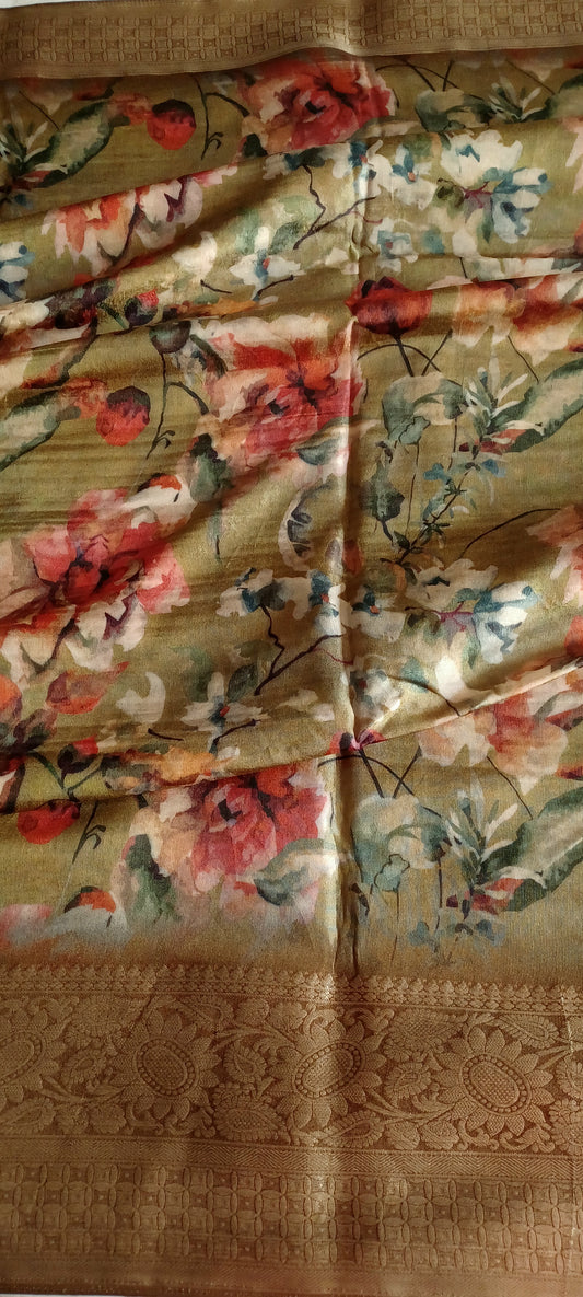 Ripe Olive Green Dola Silk Saree with Digital print and zari woven border