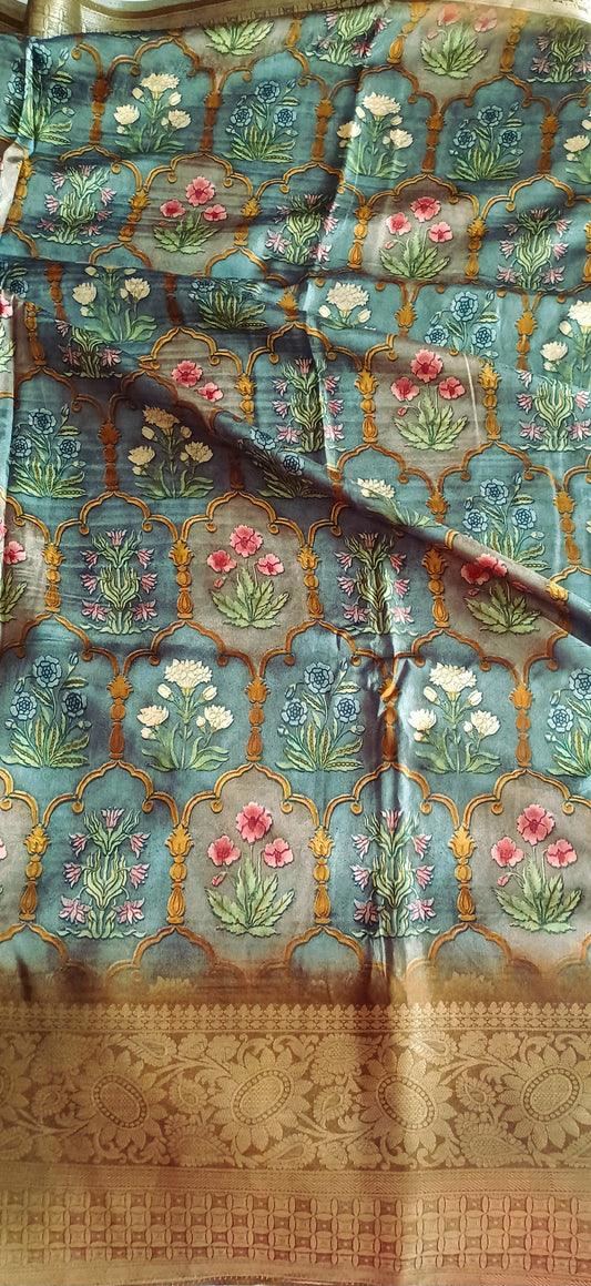 Dark blue Dola Silk Saree with Digital print and zari woven border