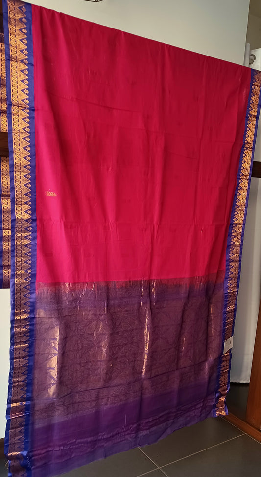 Magenta Red with contrast Dark blue border and Pallu Gadwal Cotton Saree