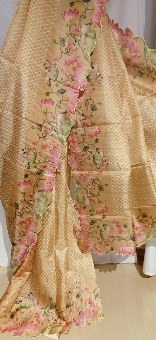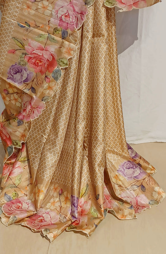 Dull Yellow semi Tussar silk saree in digital prints and scallop border