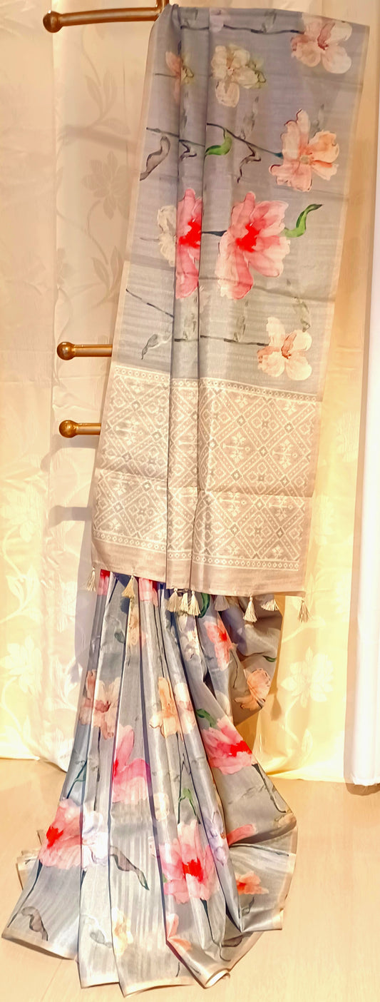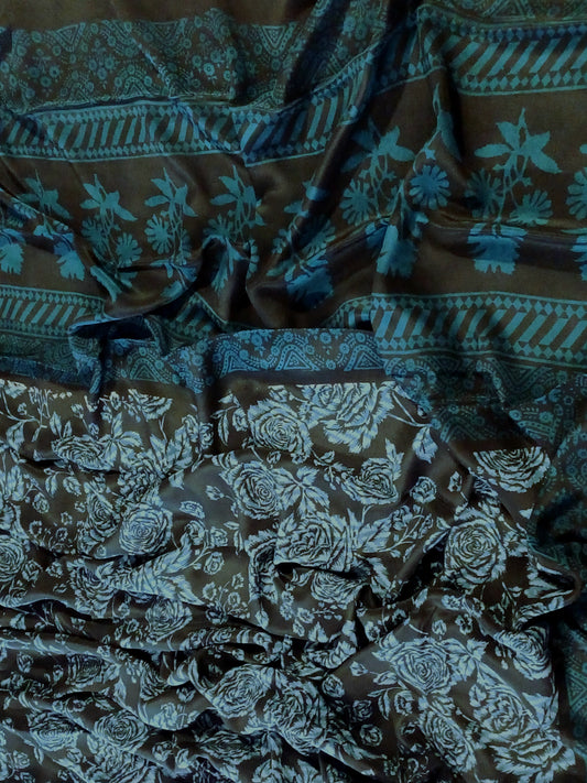 Black with Blue grey floral printed Pure Crepe Silk Saree
