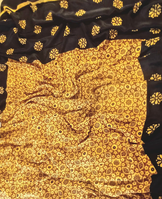 Mustard Yellow and black printed Pure Crepe Silk Saree