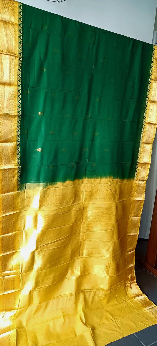 Bottle Green with contrast Yellow border and Pallu Gadwal Sico Saree (ON SALE due to Dye Stains in the blouse)