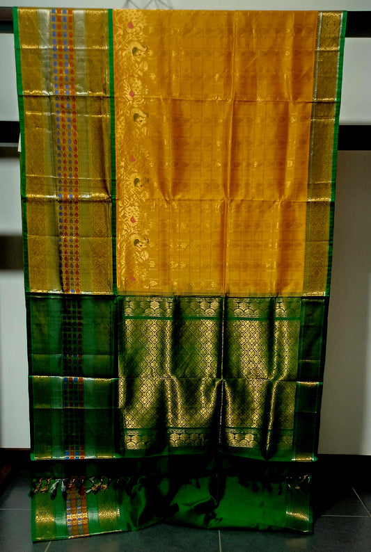 Mango yellow with green and zari woven big border Kanchi Kuppadam saree