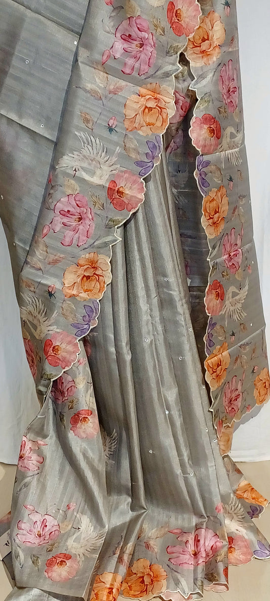 Dull Yellow semi Tussar silk saree in digital prints and scallop border