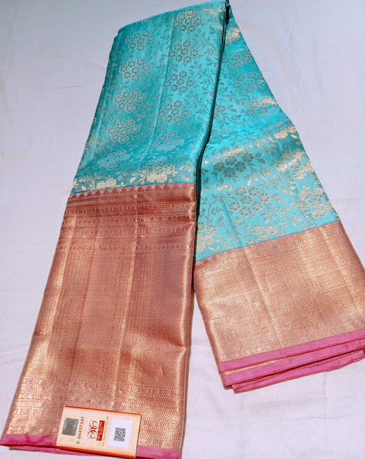 Pastel blue with pastel pink border Kanchipuram pure silk brocade weave saree