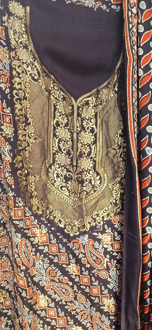 Black - 2 Piece Dola Silk Ajrakh Block Printed Natural Dyed Handcrafted Suit (Unstitched)