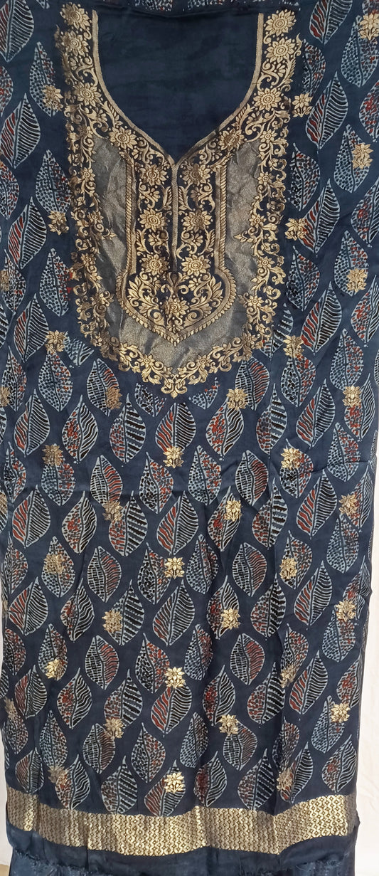 Indigo Blue - 2 Piece Dola Silk Ajrakh Block Printed Natural Dyed Handcrafted Suit (Unstitched)