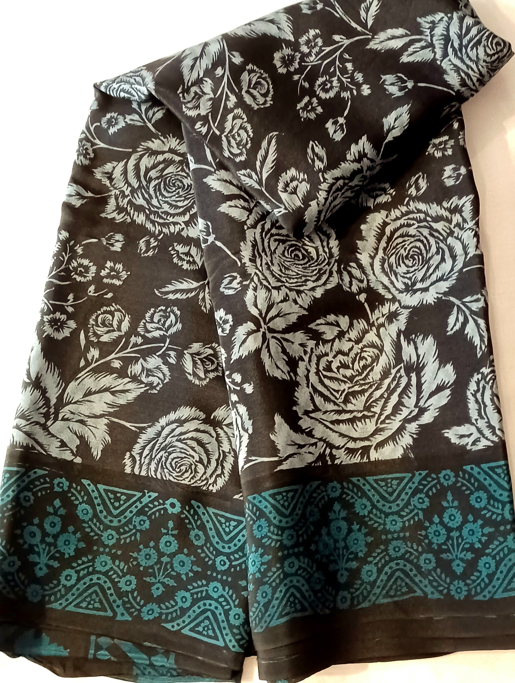 Black with Blue grey floral printed Pure Crepe Silk Saree