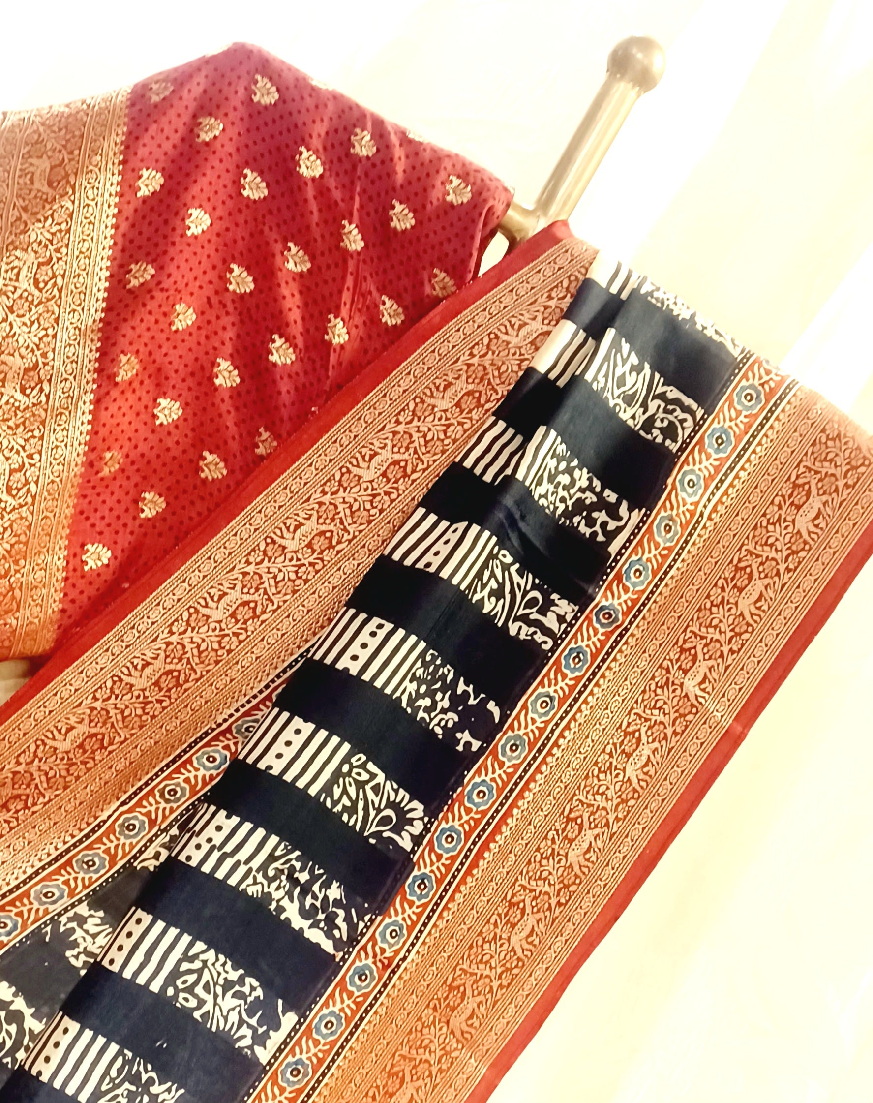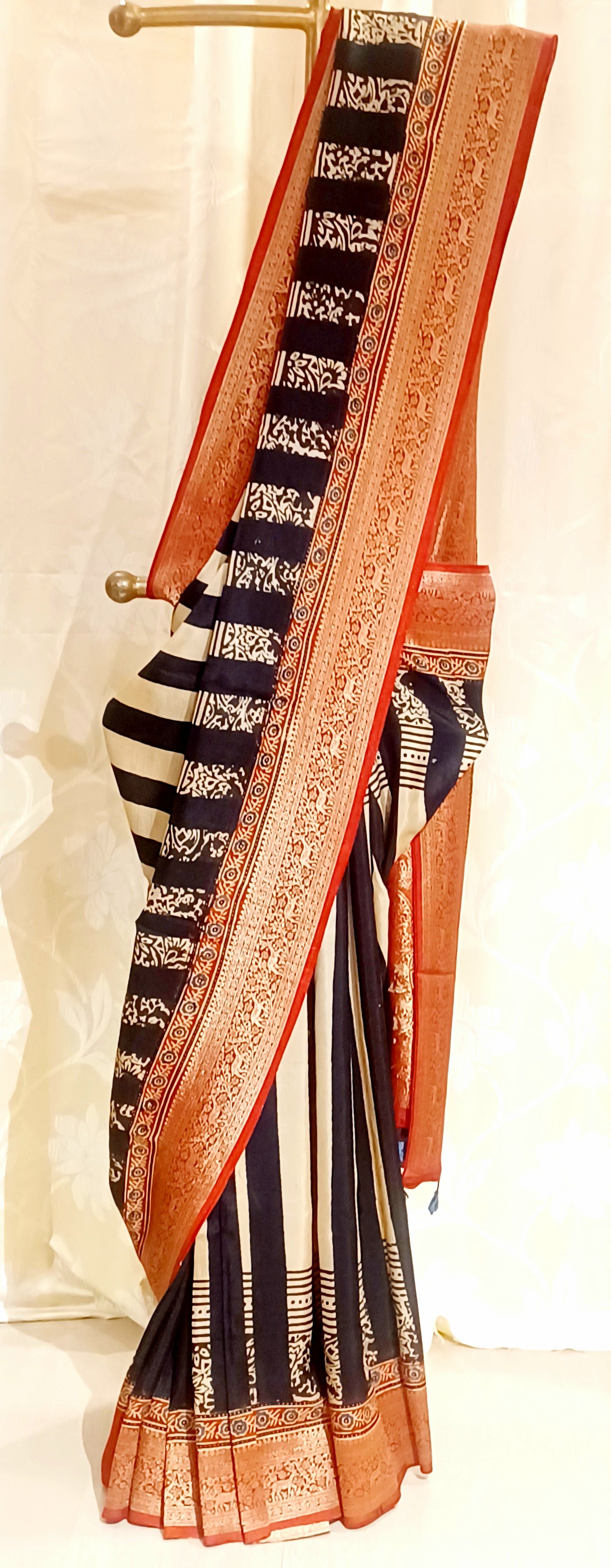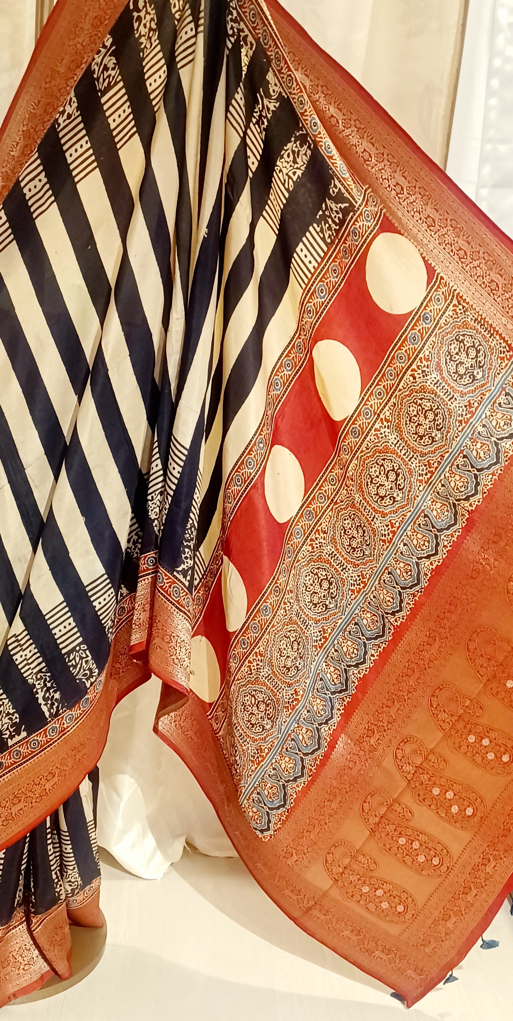 An exquisite black and off-white solid stripes saree in luxurious dola silk and handblock Ajrakh prints with antique zari border and pallu in red. This handcrafted saree drapes effortlessly with a great comfort and is a perfect choice for festive events or formal celebrations. It is sourced from a skilled artisan unit in Bhuj, Gujarat. This saree is polished and accessorized with tassels for a neat look.