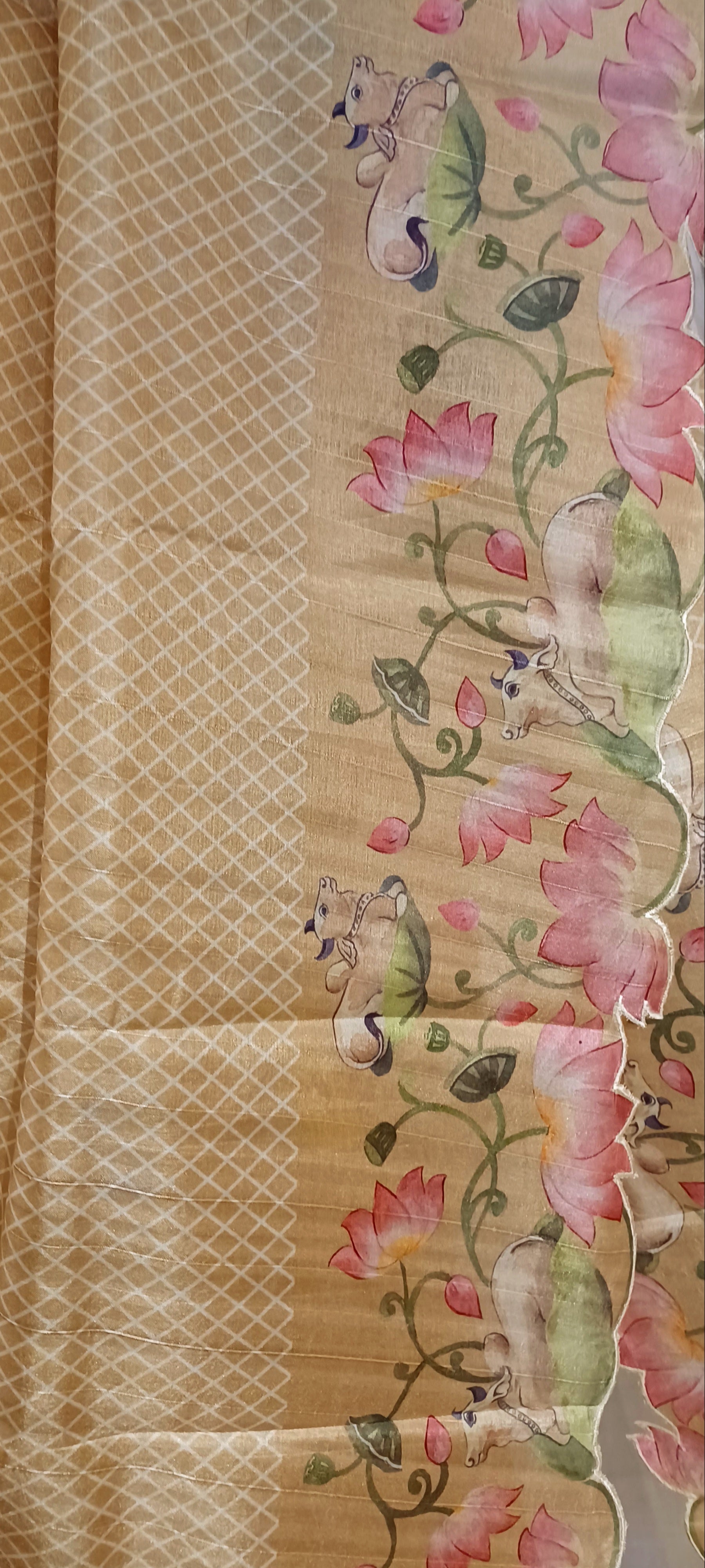 A dull yellow semi tussar silk saree with pichwai inspired digital print and scallop border. A stylish drape with a flattering fit, this saree is a stunning choice for any formal or semi-formal occasions.