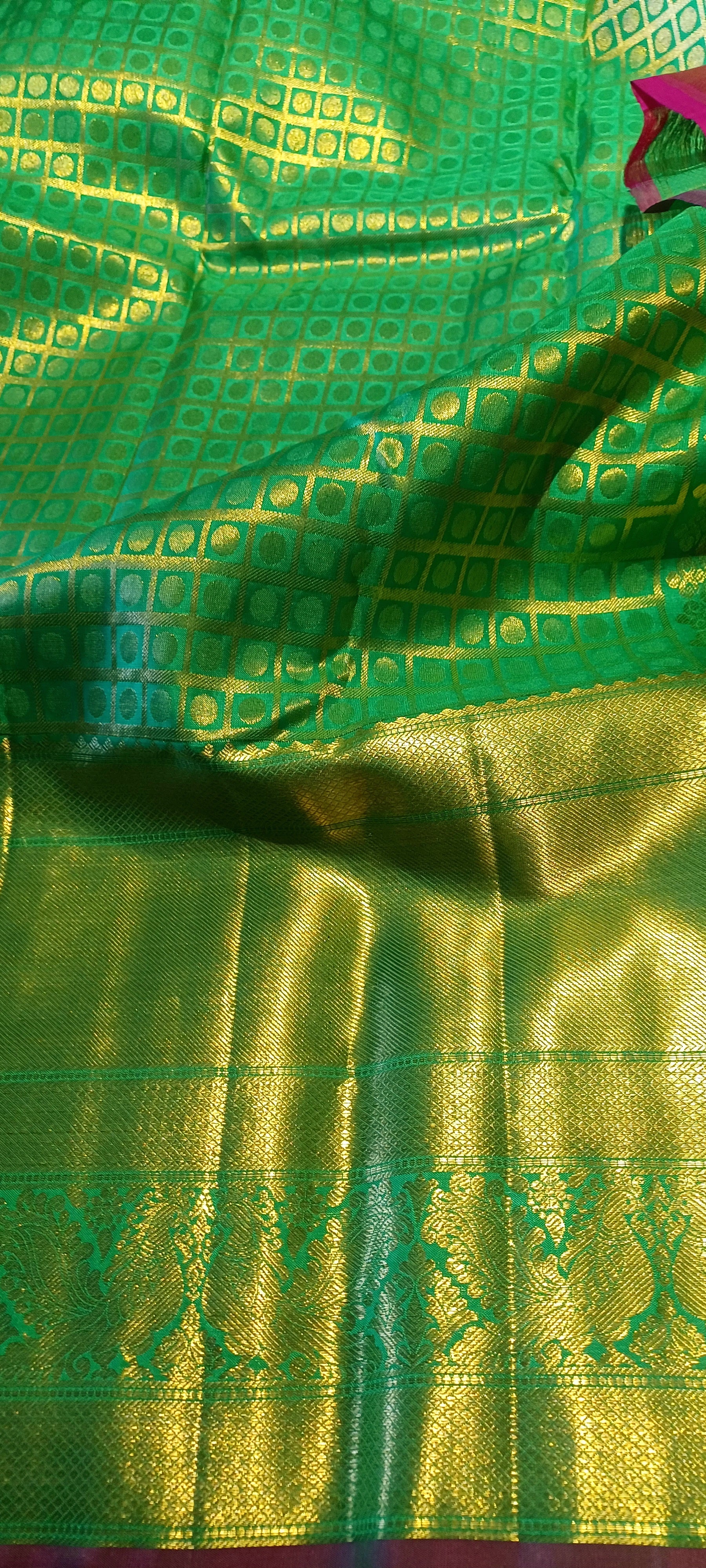 Celebrate your special moments in this heavy exquisite kanchipuram pure silk bridal saree. Crafted on a rich green base, it showcases intricate golden zari woven checks adorned with gold zari buttas. Subtle meenakari detailing adorns the zari brocade pallu, bringing refined sophistication and artistic depth to this serene monochrome saree. The striking pink piping border and coordinating pink blouse create a beautiful contrast that elevates the design. Woven from double-ply pure silk yarn with authentic zari, this saree carries the prestigious Silk Mark certification, assuring you of genuine quality. Whether you're walking down the aisle, attending a festival, or marking milestones like gruhapravesham or baby showers, this timeless piece brings class and tradition to every celebration.