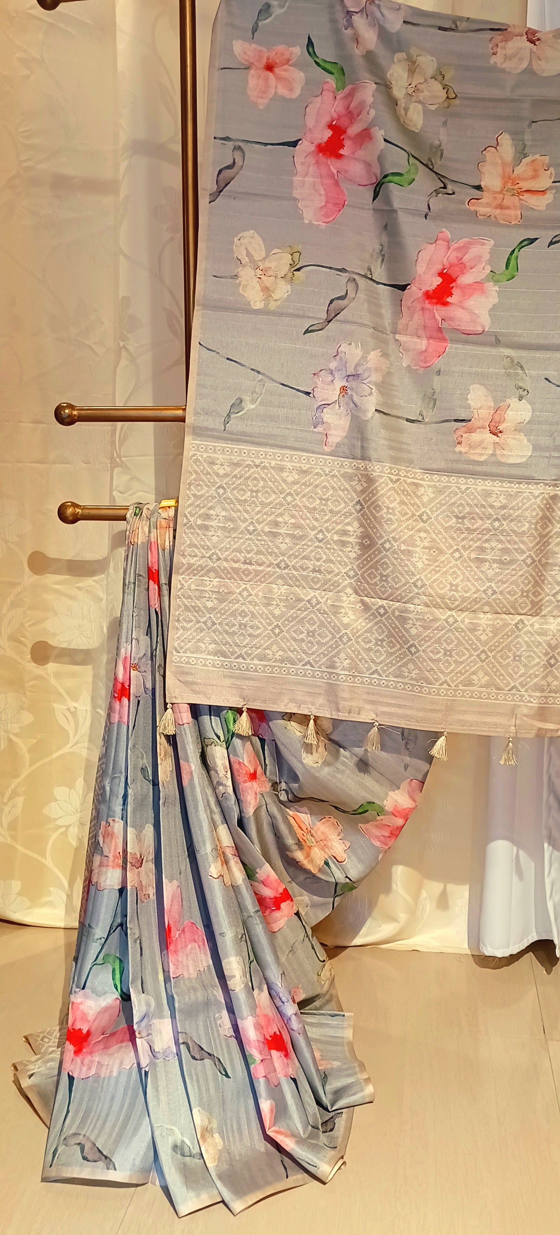 A grey semi tussar silk saree with a floral digital print all over. A stylish drape with a flattering fit, this saree is a stunning choice for casual wear or any formal or semi-formal occasions.