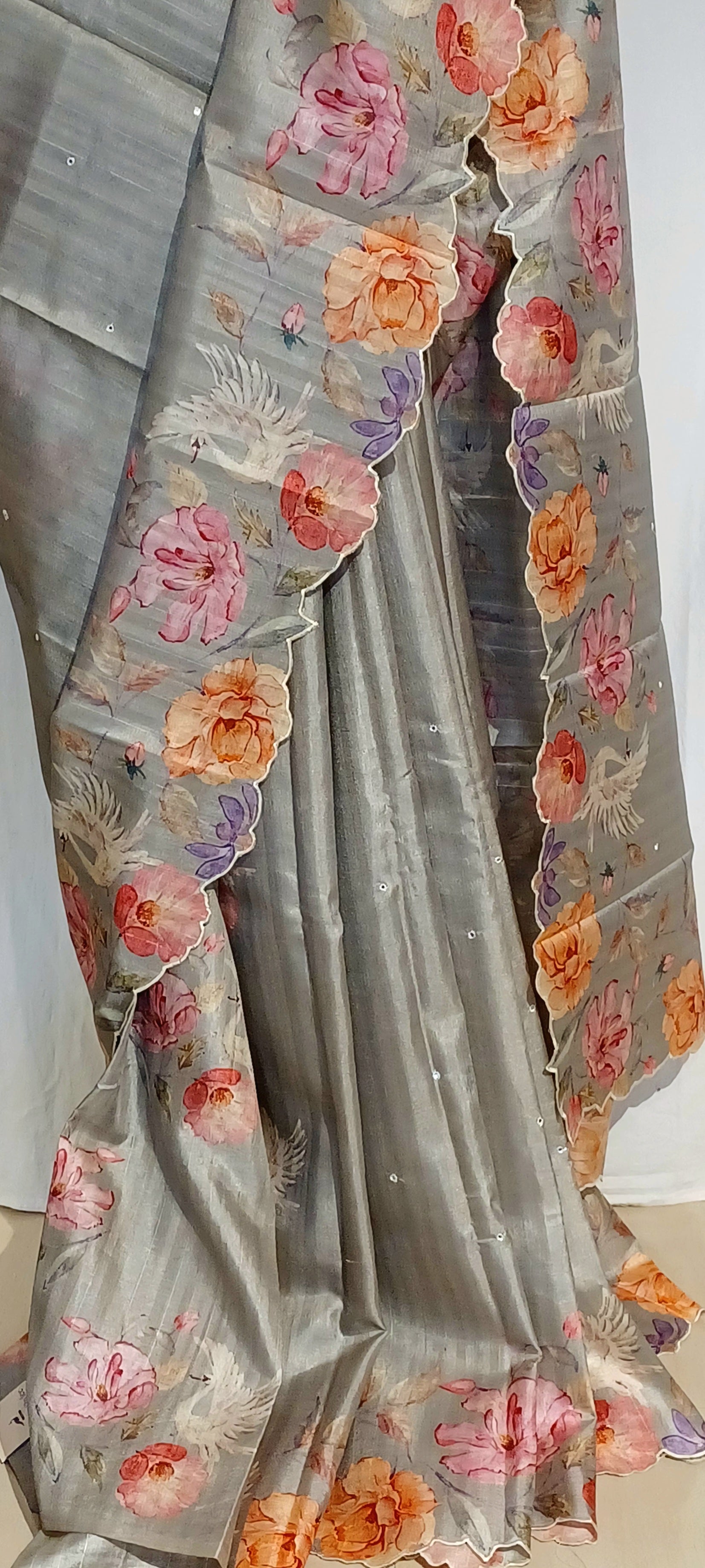 A grey semi tussar silk saree with a floral digital print and scallop border embellished with mirrors. A stylish drape with a flattering fit, this saree is a stunning choice for any formal or semi-formal occasions.