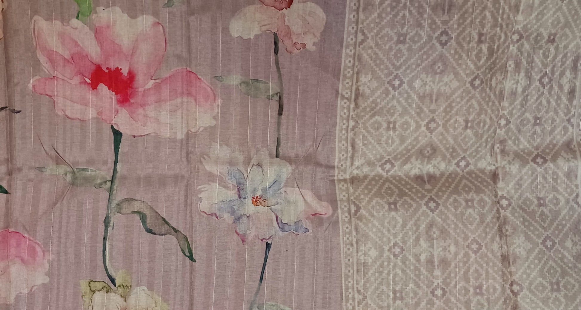 A light mauve semi tussar silk saree with a floral digital print all over. A stylish drape with a flattering fit, this saree is a stunning choice for casual wear or any formal or semi-formal occasions.