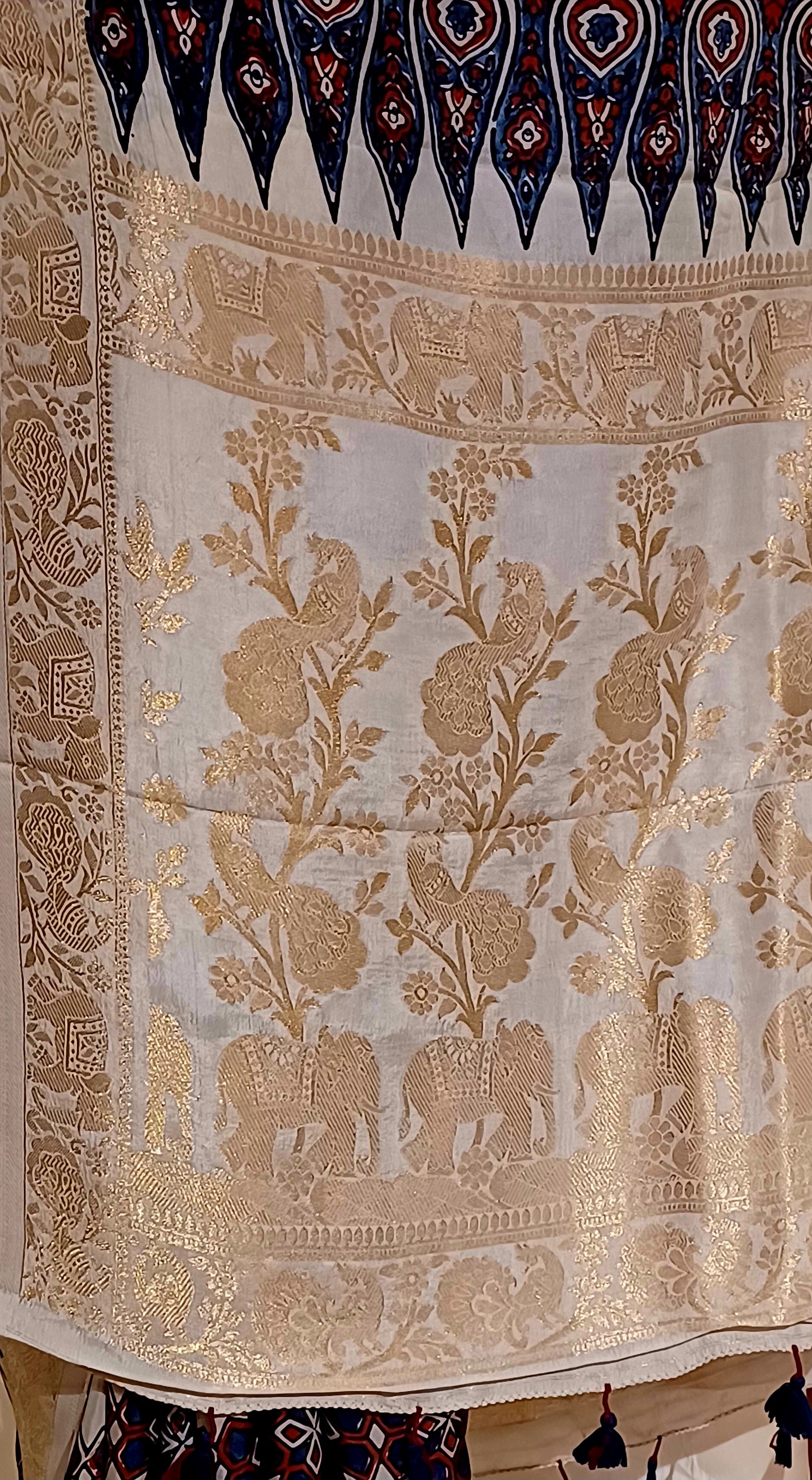 An irresistable off-white saree in luxurious dola silk and indigo blue and red handblock Ajrakh prints with an antique zari border and pallu. This handcrafted saree drapes effortlessly with a great comfort and is a perfect choice for festive events or formal celebrations. It is sourced from a skilled artisan unit in Bhuj, Gujarat. This saree is polished and accessorized with tassels for a neat look.