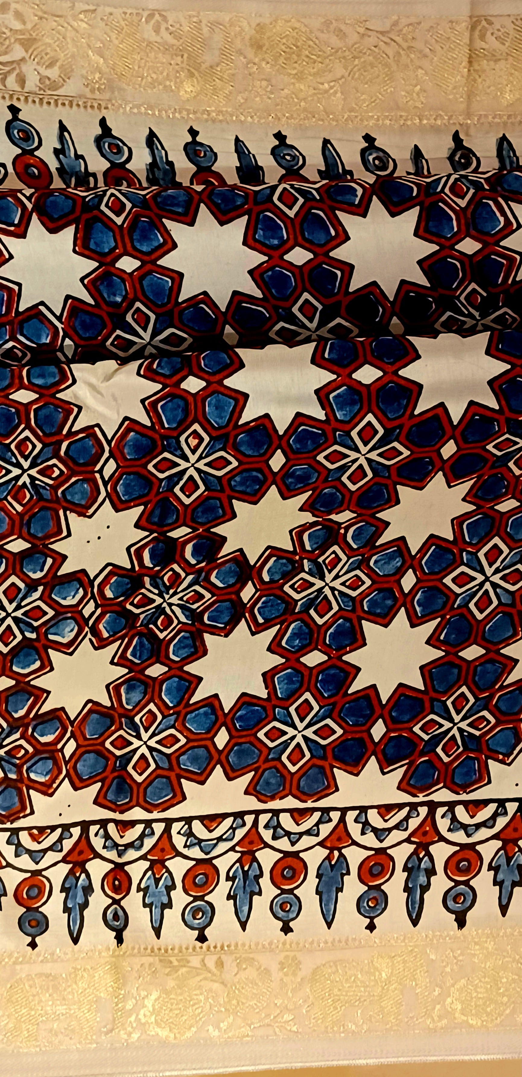 Off-white Dola Silk with Indigo and Red Ajrakh print saree