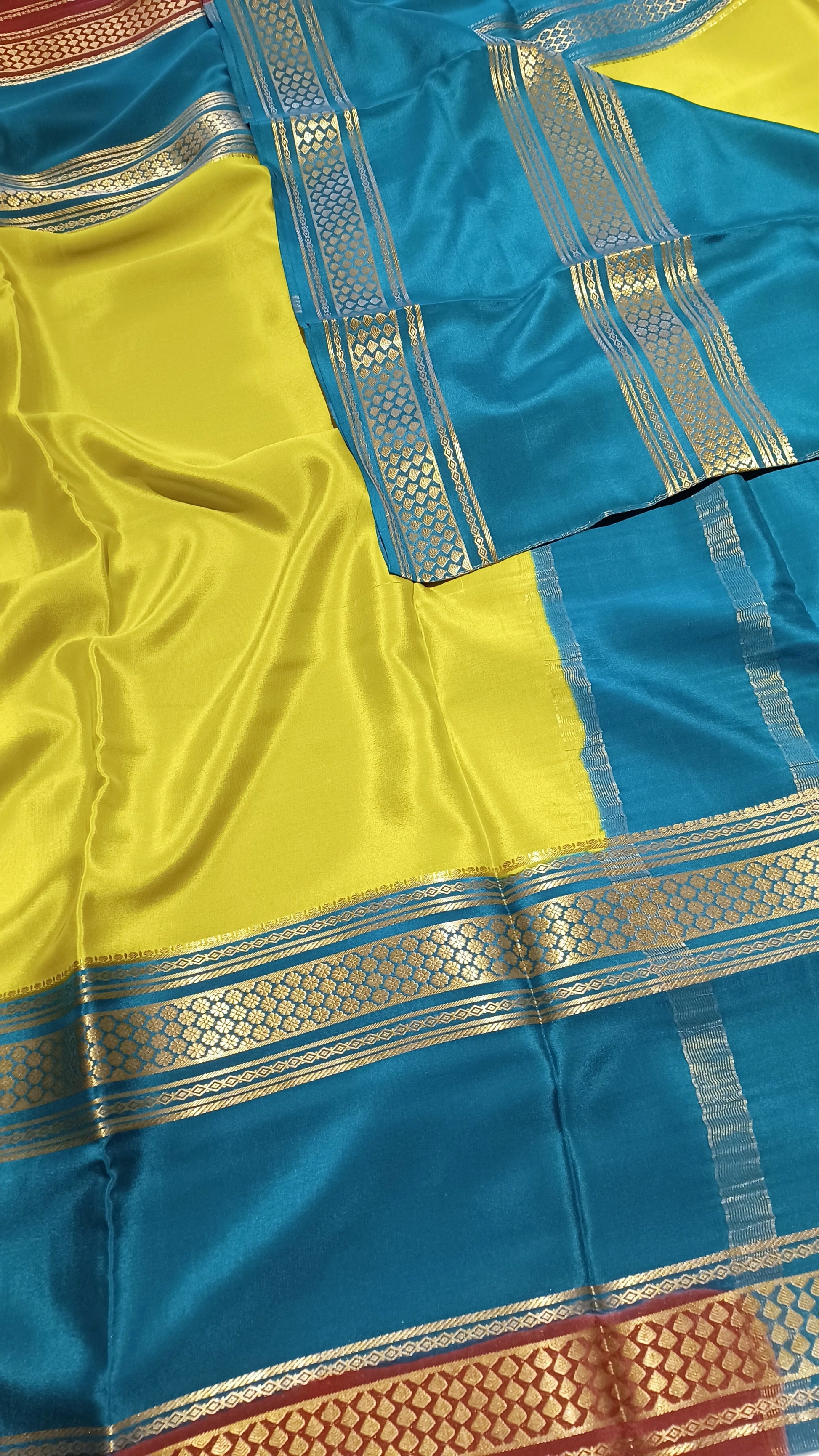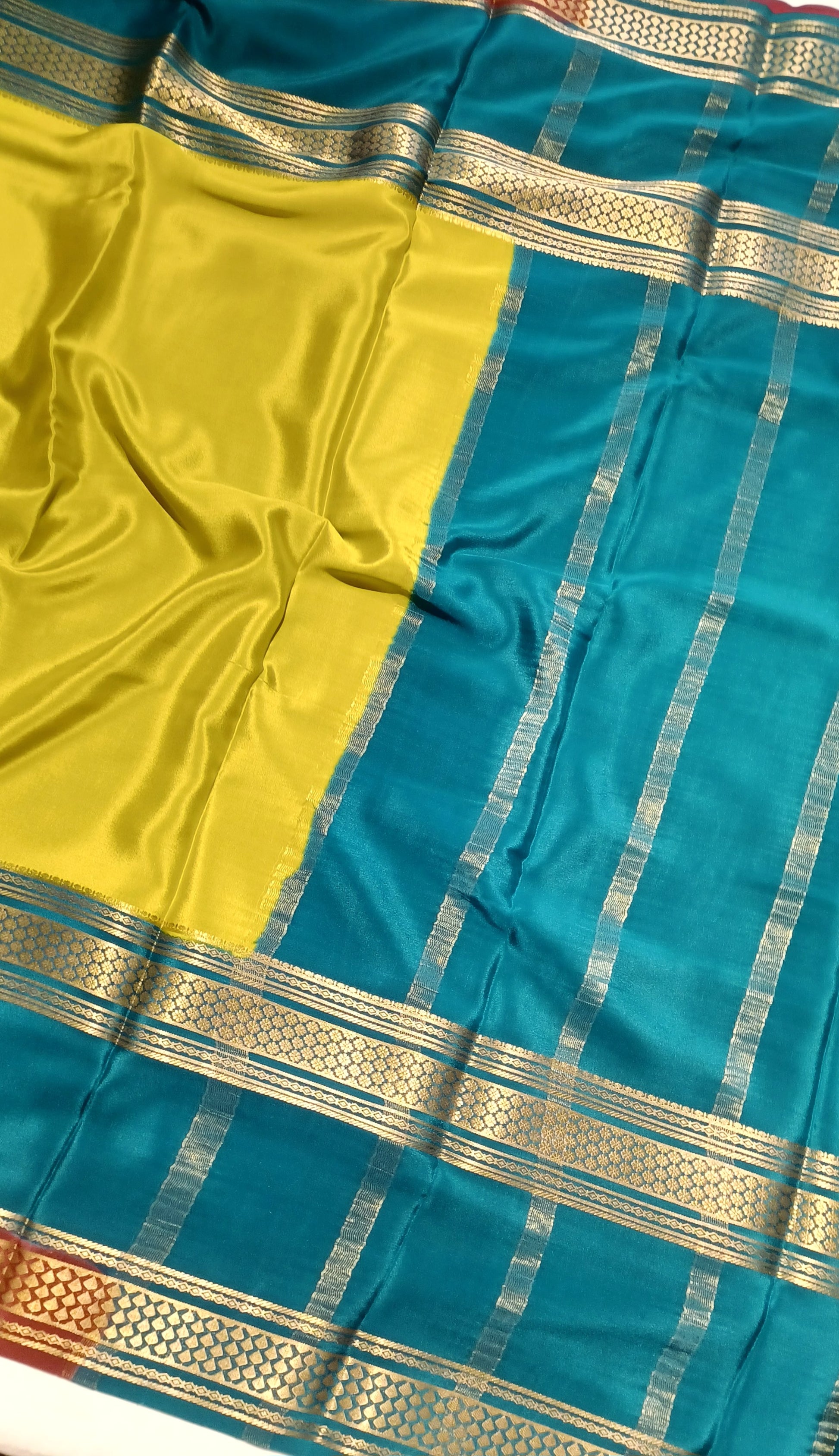 Celebrate the heritage of Karnataka with this luxurious pure 3D Mysore crepe silk saree adorned with 3 colour combination in enchanting hues of olive yellow paired with teal green and dark red border adorned with teal green pallu and blouse. SILK MARK CERTIFIED for the authentic quality of premium 120GSM silk and 2G pure zari. Whether you drape it for a wedding, festival, or any meaningful celebration, this saree will surely make you feel luxurious.